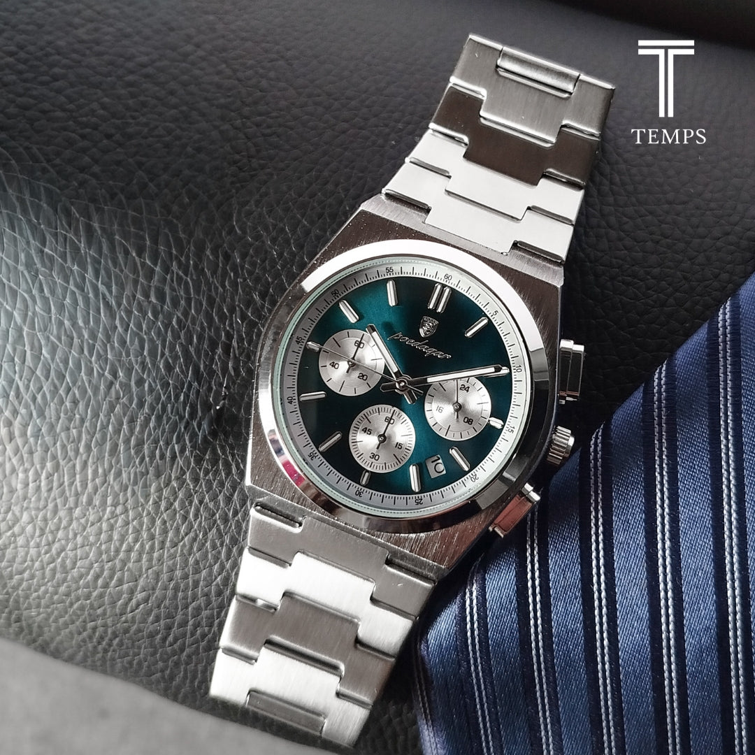 Descubre nuestro reloj de lujo Poedagar 970B, un cronógrafo de lujo con caja de aleación y pulsera de acero inoxidable. Su carátula celeste turquesa resalta con subesferas funcionales, fechador integrado y agujas con lumen. Su cristal resistente a los rasguños garantiza durabilidad y un estilo impecable en cualquier ocasión.