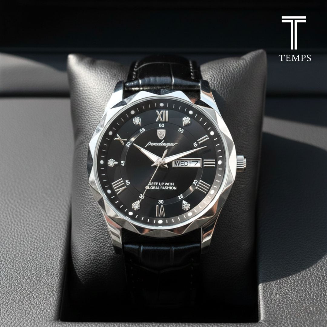 Descubre la exclusividad de nuestro reloj Poedagar P615 Su carátula negra profunda, realzada con marcadores con brillo tipo diamante y numerales romanos, transmite sofisticación y carácter en un solo vistazo. Su cristal Haydex resistente a los rasguños, garantiza durabilidad y una apariencia impecable por más tiempo.