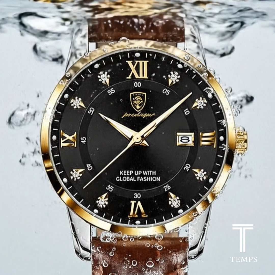 Su carátula negra sofisticada, realzada con detalles dorados y marcadores con brillo, lo convierten en una pieza sutilmente deslumbrante. Diseñado para mujeres que expresan su estilo con elegancia y seguridad.